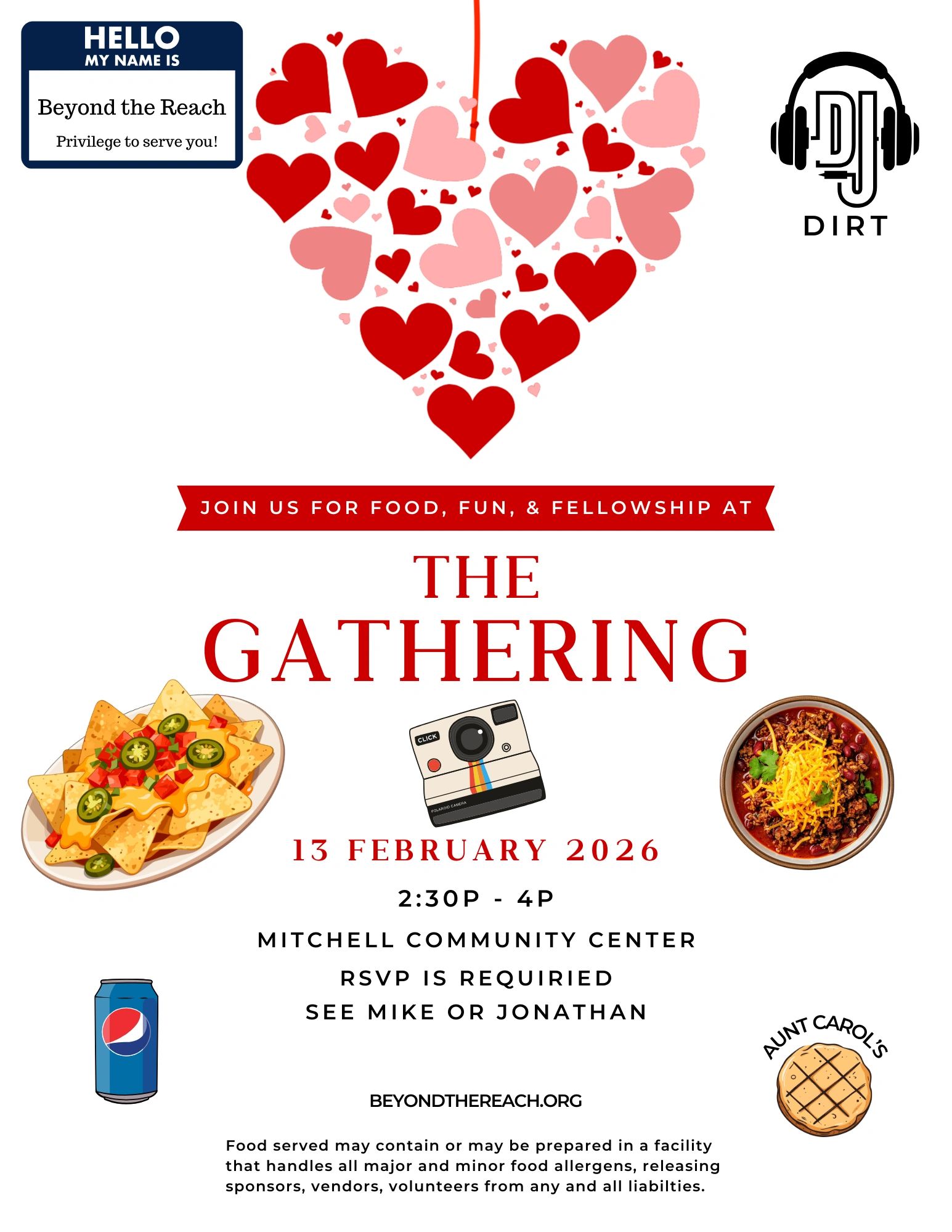 Beyond the REACH will host its Valentine Gathering. Students will munch on chili and nachos, topping it off w/a dessert bar featuring Aunt Carol's Cookies.